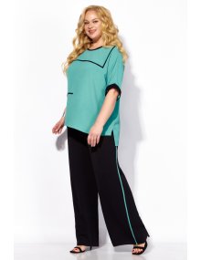 Для "песочных часов" (пропорциональная фигура): подчеркнет талию за счет накидного кроя блузона и свободных брюк.