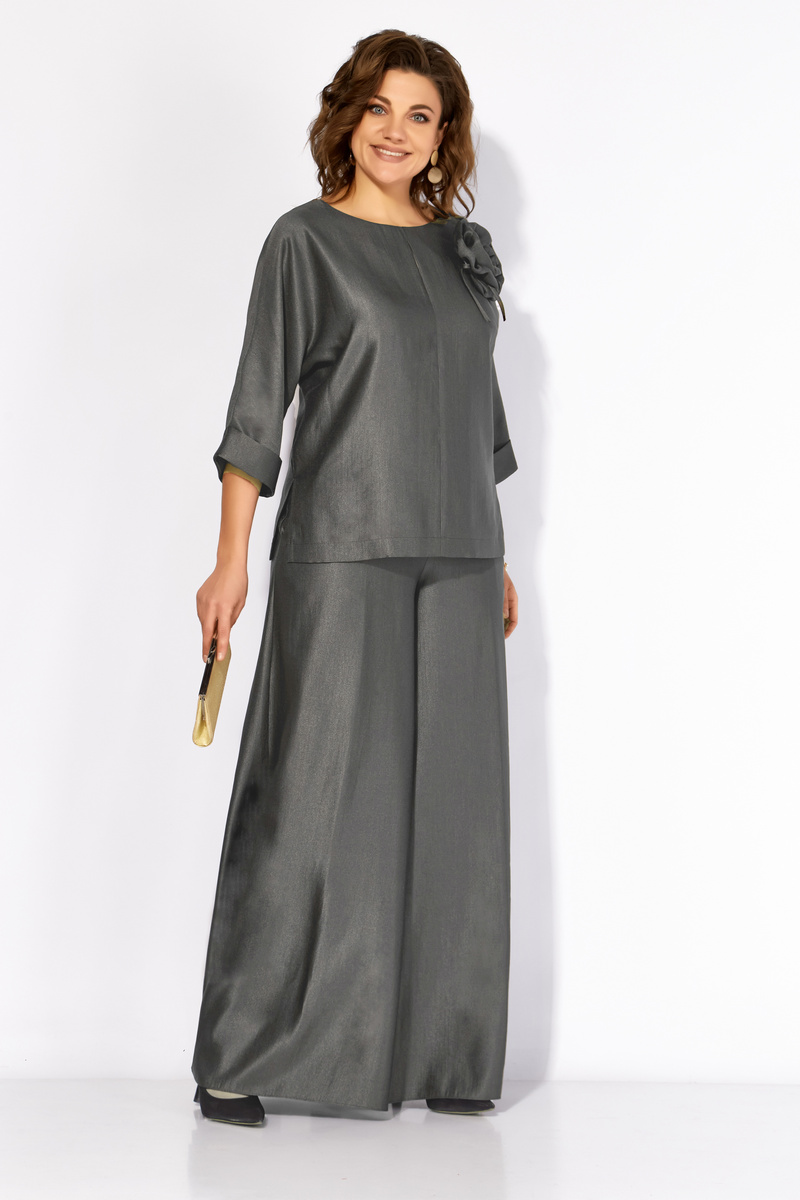 Рукава "летучая мышь", объемные в пройме, длиной до локтя, по низу обработаны манжетой. Юбка-брюки свободные прямые, на притачном поясе с частичной сборкой на резинку и застежкой на потайную молнию по среднему шву спинки Высокая посадка в сочетании с oversize-блузоном создает баланс силуэта. Широкие брюки-юбка добавляют динамику, что соответствует тренду. К комплекту прилагается съемный декор в виде цветка крепящегося на булавку.
