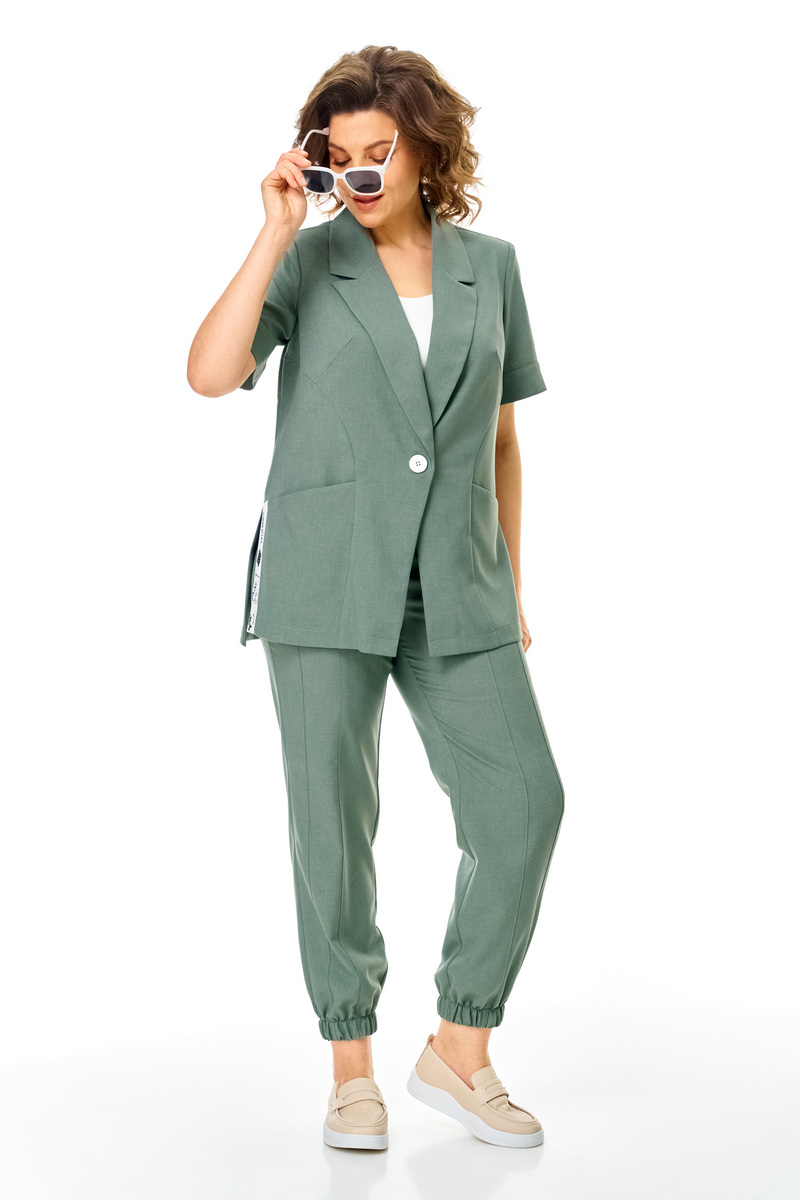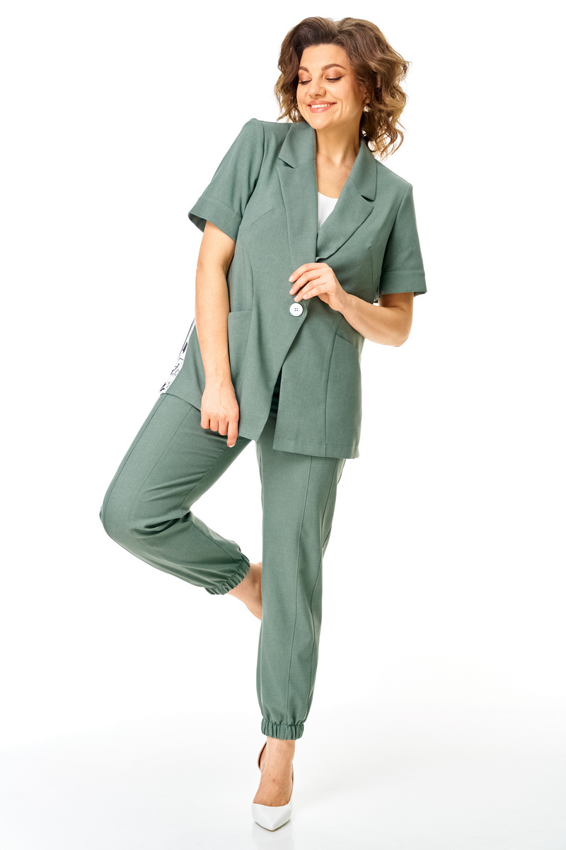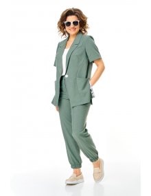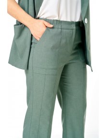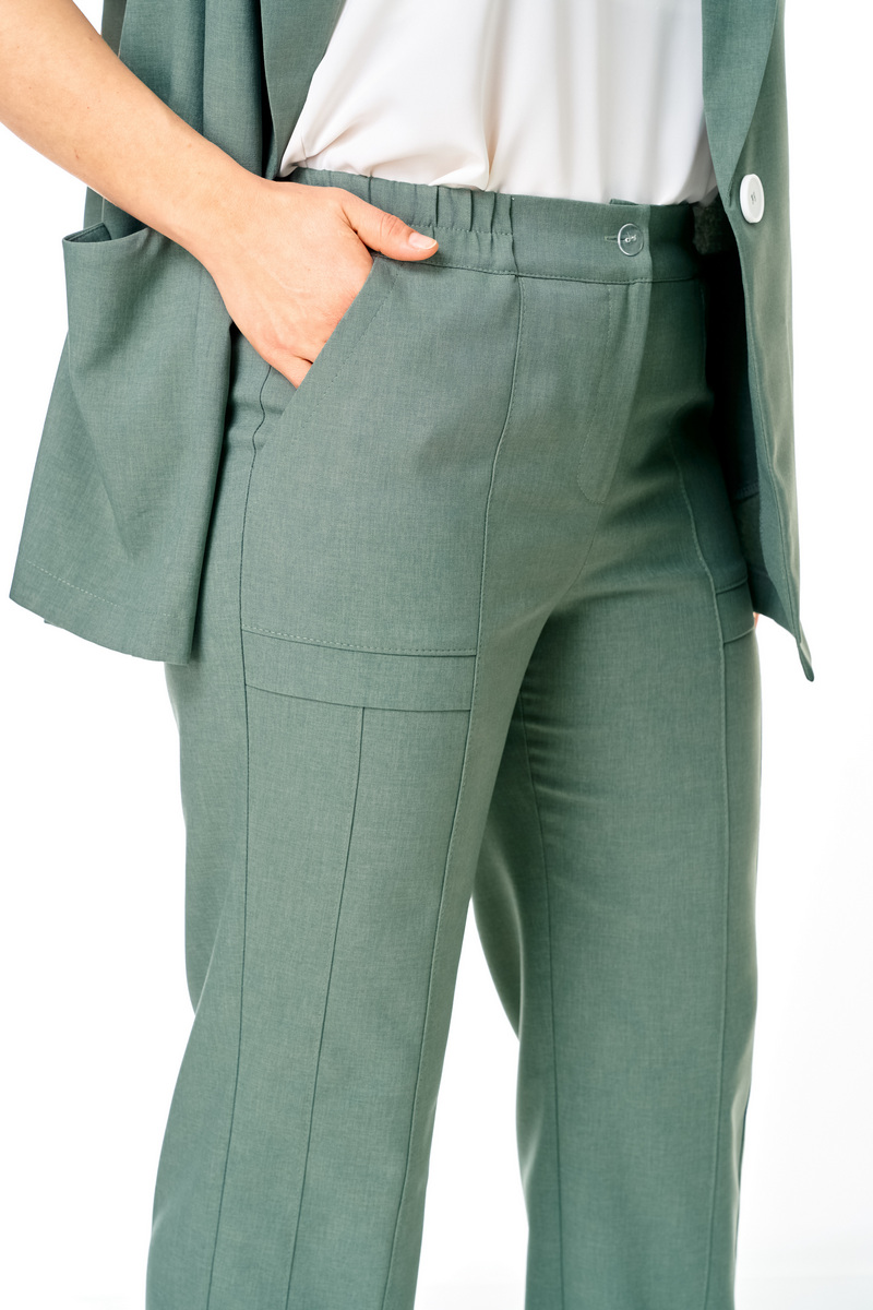 Брюки прямые, на притачном поясе в котором по задней части выполнены вставки из эластичной резинки. По переду выполнена застежка типа «гульфик» на тесьму-молнию. По низу брюки собраны на резинку. По передней части брюк выполнен карман. Длина брюк 7\8. Комплект смотрится стильно и элегантно, подойдет для жаркой погоды. Прекрасно подойдёт как для работы, так и для любых летних мероприятий.