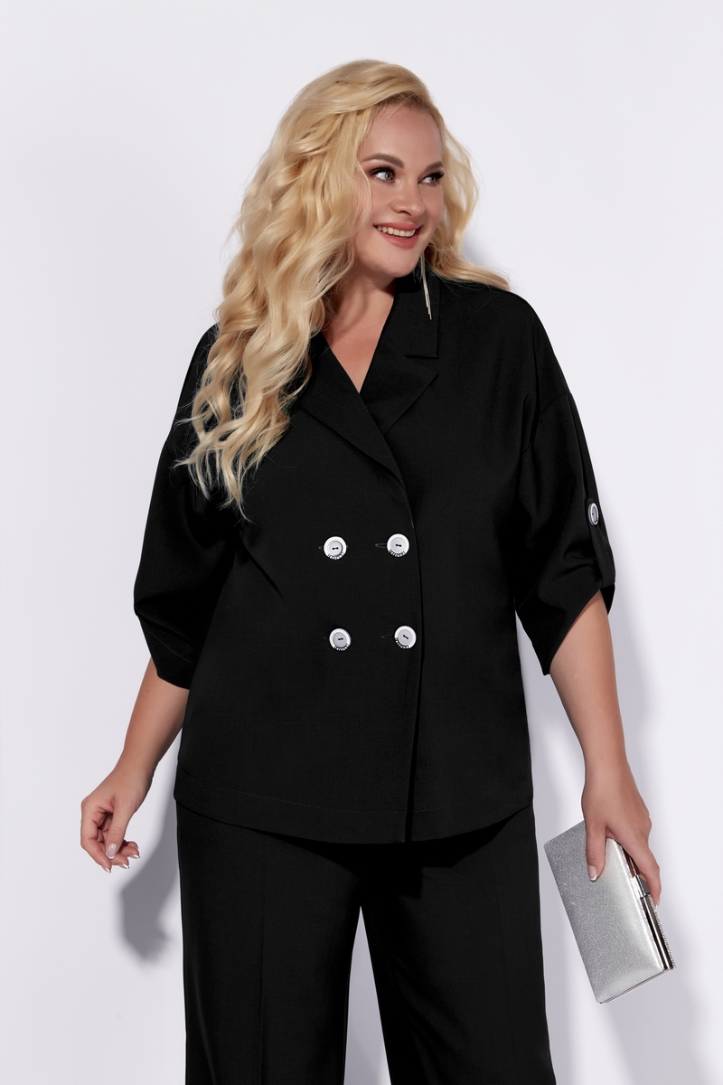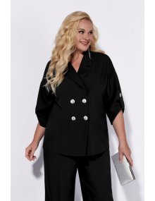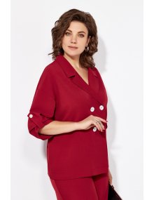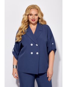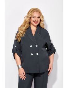 Жакет без подкладки, с V-образным вырезом, оформленный отложным воротником. Застежка ассиметричная, двубортная, на четыре петли-пуговицы. Рукав жакета выполнен на основе спущенной проймы, что придает образу мягкости и легкости. Длина рукава ¾, по низу выполнена пата.