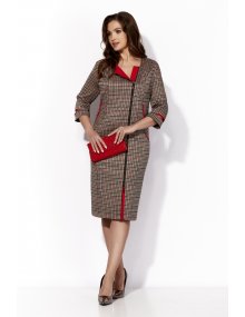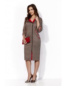 Особенностью этого платья является смещенная застежка на молнию, создающая динамичный и современный образ. Безусловной изюминкой становится отделка в виде красного под борта, добавляющая платью дополнительный шик и выразительность.