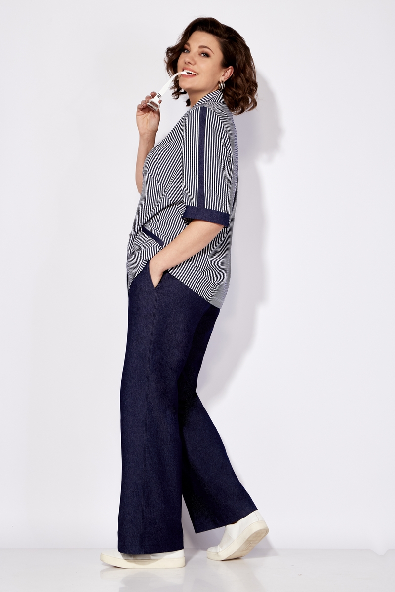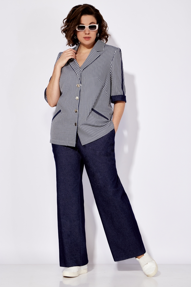Модель Теллура-Л, М-1730Размеры: 54 - 58 Тип: Комплект Состав ткани: 63% хлопок, 33% нейлон, 4% спандекс (текстиль) Описание: Стильный и современный женский комплект, 2-х предметный, состоит из жакета и брюк. Жакет выполнен из натурального тонкого джинсового хлопкового материала с современным дизайном в полоску. Брюки из джинса средней плотности. Изделие станет прекрасным дополнением в гардеробе любой модницы, прекрасно подойдет для повседневной носки. Жакет прямого, свободного силуэта. По переду расположены нагрудные выточки, ниже линии талии карман оформленный входом в рамку. Вырез горловины V-образный оформлен отложным воротником. Застежка на петли-пуговицы по центральной части переда. Спинка со средним швом, рельефами, кокеткой. Рукав втачной, двухшовный, по низу с отложной манжетой. Брюки прямые, свободные, слегка расширенны к низу, на притачном поясе со сборкой на резинку по задней части, а также с застежкой на молнию по передней части. По верхней части брюк выполнены карманы между боковым швом и поясом. Длина жакета ок. 67 см Длина рукава жакета ок. 35 см Длина брюк ок. 102 см НАЗАД К КОЛЛЕКЦИИ |