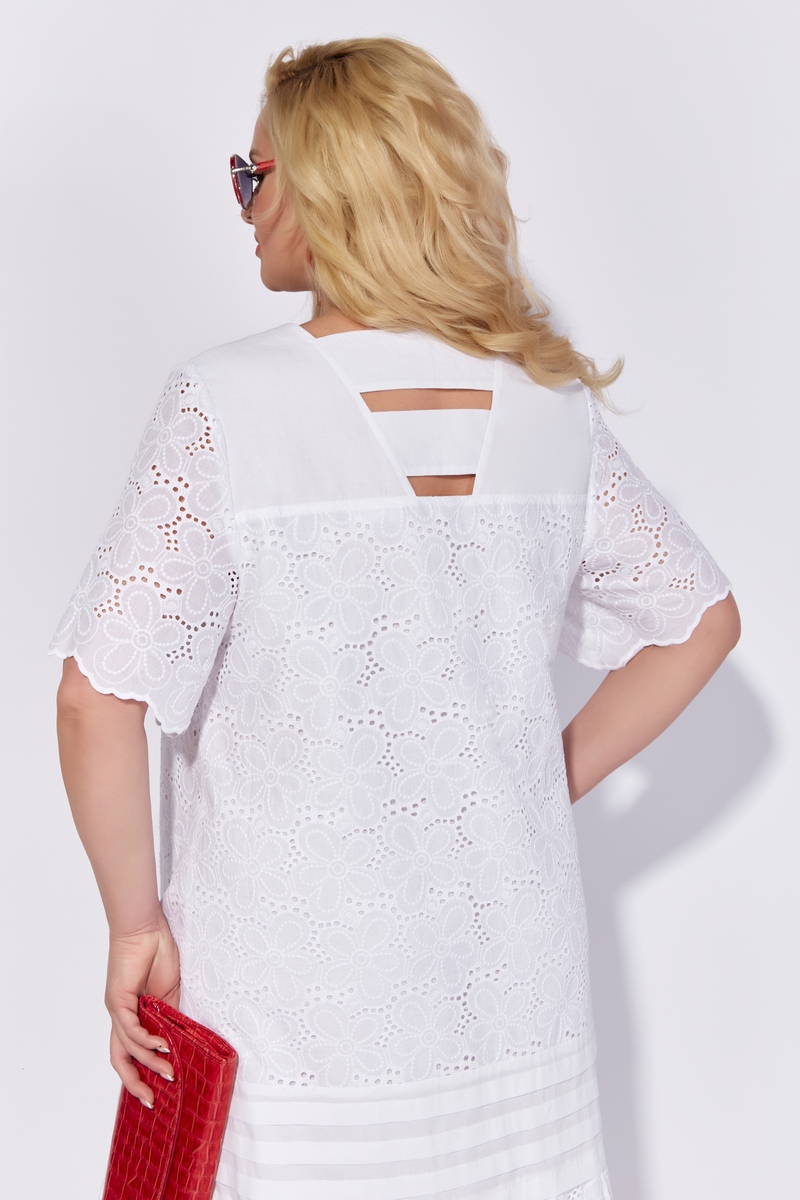 Модель Теллура-Л, М-1742Размеры: 54 - 64 Тип: Платье Состав ткани: 96% хлопок, 4% спандекс (текстиль) Описание: Элегантное и изысканное, нарядное женское платье прямого, свободного, расширенного к низу силуэта, выполнено из хлопкового полотна с дизайном вышивкой с перфорацией и гладкого полотна в качестве отделки. Платье на хлопковой подкладке. Вырез горловины округлый, подчеркивает линию шеи. Изюминка платья в фигурной спинке, выполненной из нескольких частей формирующих разрезы. Рукав втачной, короткий, выше локтя. По низу платья расположен волан с небольшой сборкой. Платье превосходно подойдет как для торжественных мероприятий, так и для повседневной носки. Не упустите возможность приобрести это нарядное платье, сочетающий в себе стиль, универсальность и комфорт. Если вы посещаете свадьбу как гость, идете на коктейльную вечеринку или празднуете свой день рождения, это платье является ответом на все ваши модные потребности. Благодаря натуральному составу материала изделие превосходно подойдет для носки в самый жаркий летний день, позволит чувствовать себя уверено и комфортно. Длина платья ок. 116 см Длина рукава ок. 27 см НАЗАД К КОЛЛЕКЦИИ |