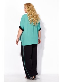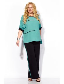 Для "песочных часов" (пропорциональная фигура): подчеркнет талию за счет накидного кроя блузона и свободных брюк.