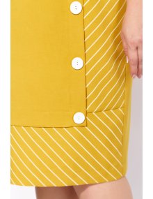 Стильное женское платье полуприлегающего силуэта в стиле «спорт-шик». Платье выполнено из трикотажной ткани в двух расцветках, полоска и однотон. Горловина круглая. Рукава втачные одношовные с отделкой в виде вставки из отделочной ткани. По переду обработана горизонтальная кокетка и диагональный подрез. Перед ассиметричен, справа, в области бедра, выполнен функциональный накладной карман, слева, карман оформлен листочкой. В качестве отделки добавлены декоративные нашивки.
