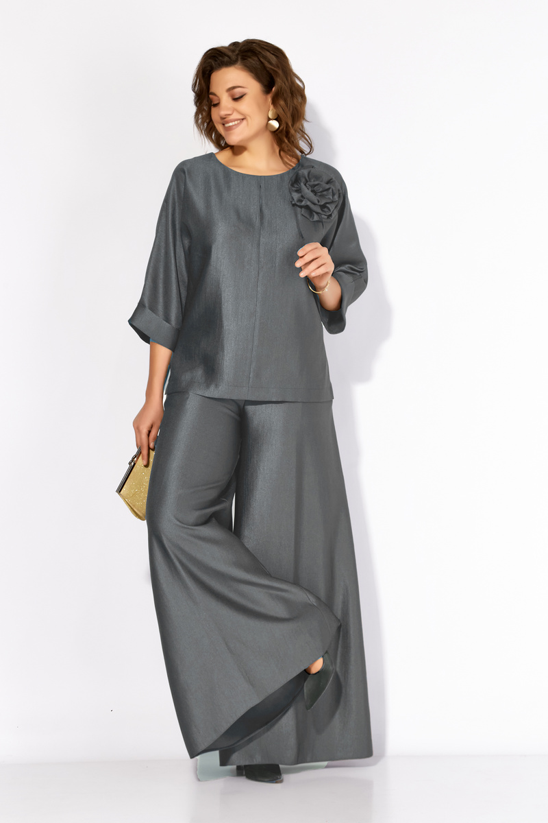 Рукава "летучая мышь", объемные в пройме, длиной до локтя, по низу обработаны манжетой. Юбка-брюки свободные прямые, на притачном поясе с частичной сборкой на резинку и застежкой на потайную молнию по среднему шву спинки Высокая посадка в сочетании с oversize-блузоном создает баланс силуэта. Широкие брюки-юбка добавляют динамику, что соответствует тренду. К комплекту прилагается съемный декор в виде цветка крепящегося на булавку.