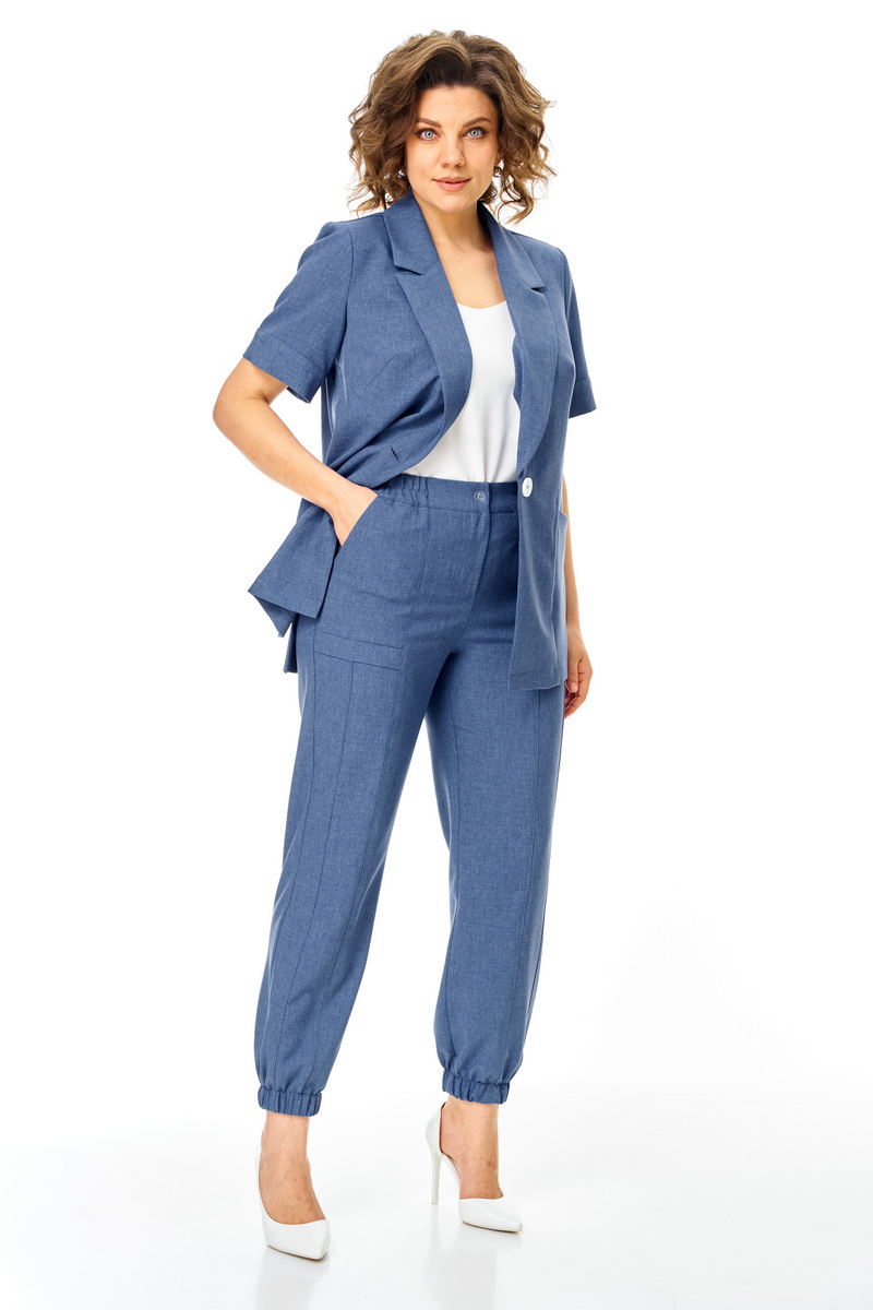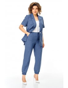 Брюки прямые, на притачном поясе в котором по задней части выполнены вставки из эластичной резинки. По переду выполнена застежка типа «гульфик» на тесьму-молнию. По низу брюки собраны на резинку. По передней части брюк выполнен карман. Длина брюк 7\8. Комплект смотрится стильно и элегантно, подойдет для жаркой погоды. Прекрасно подойдёт как для работы, так и для любых летних мероприятий.