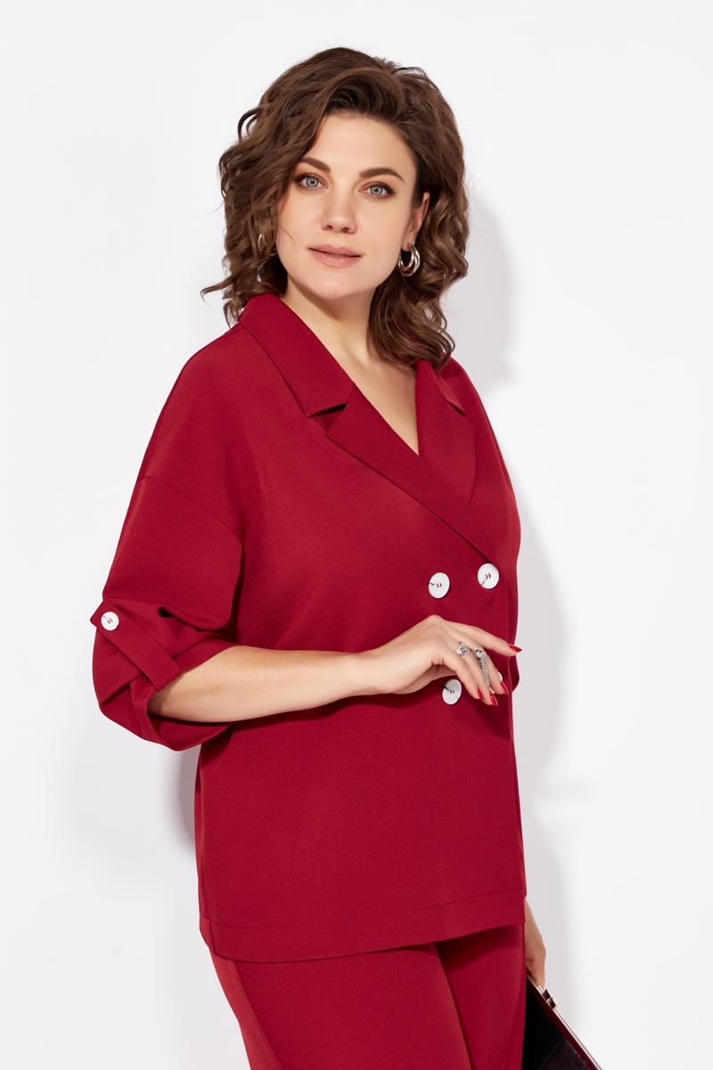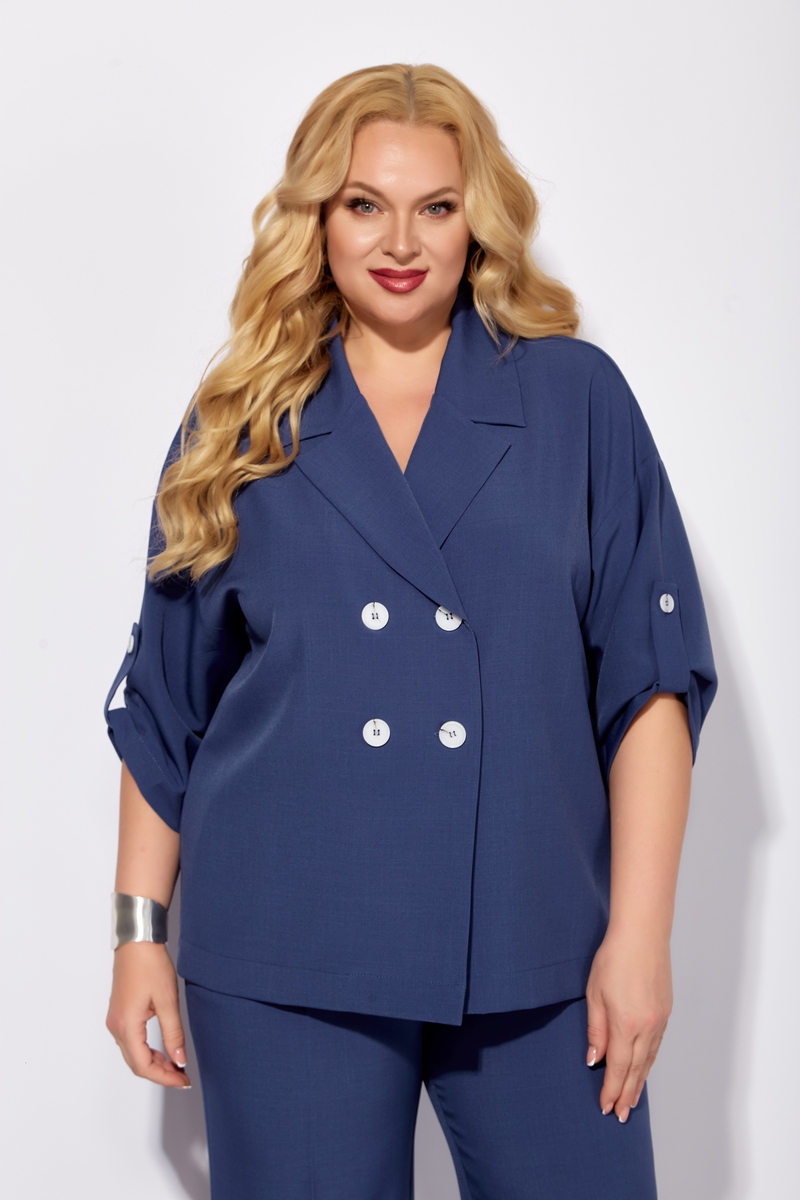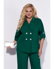 Жакет без подкладки, с V-образным вырезом, оформленный отложным воротником. Застежка ассиметричная, двубортная, на четыре петли-пуговицы. Рукав жакета выполнен на основе спущенной проймы, что придает образу мягкости и легкости. Длина рукава ¾, по низу выполнена пата.