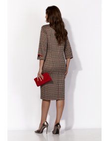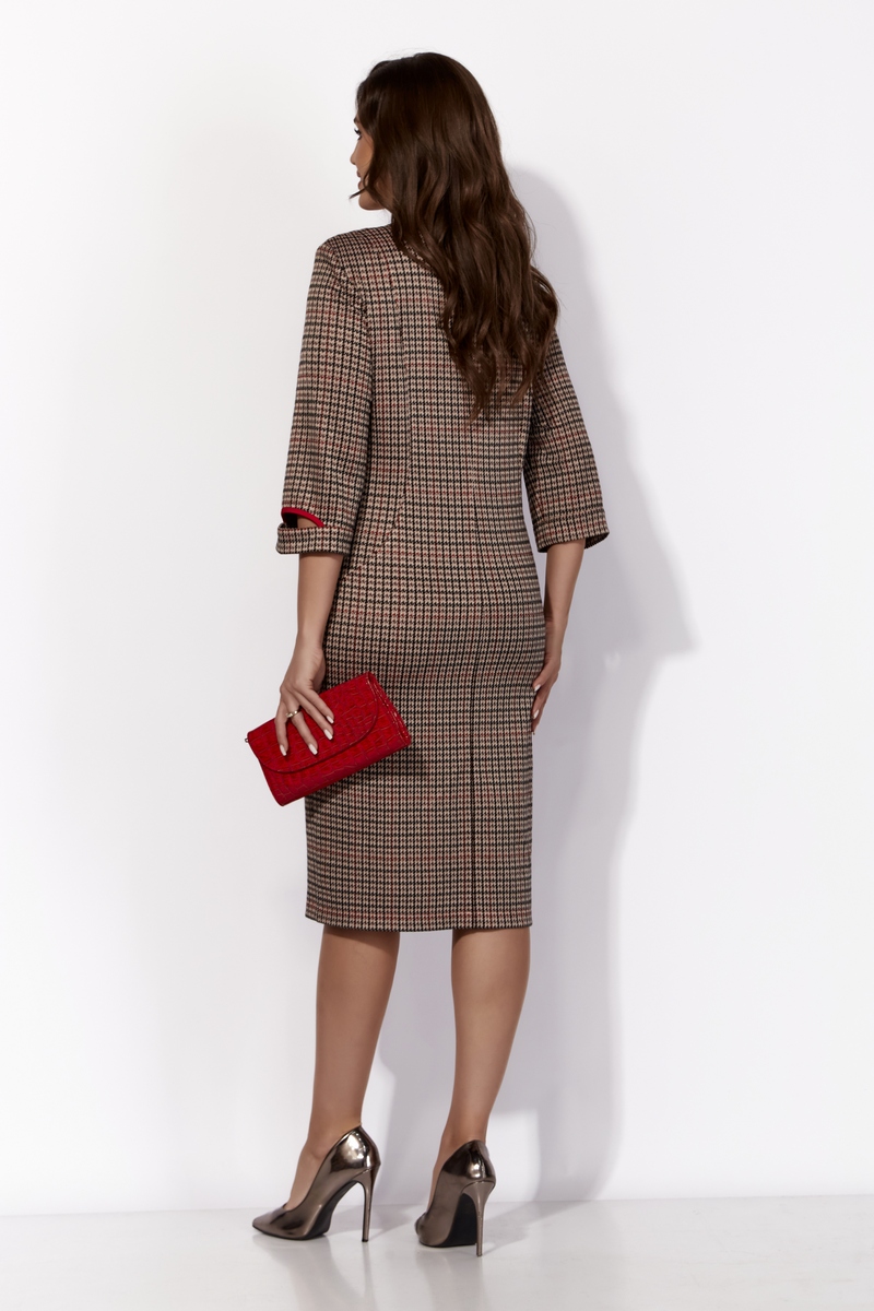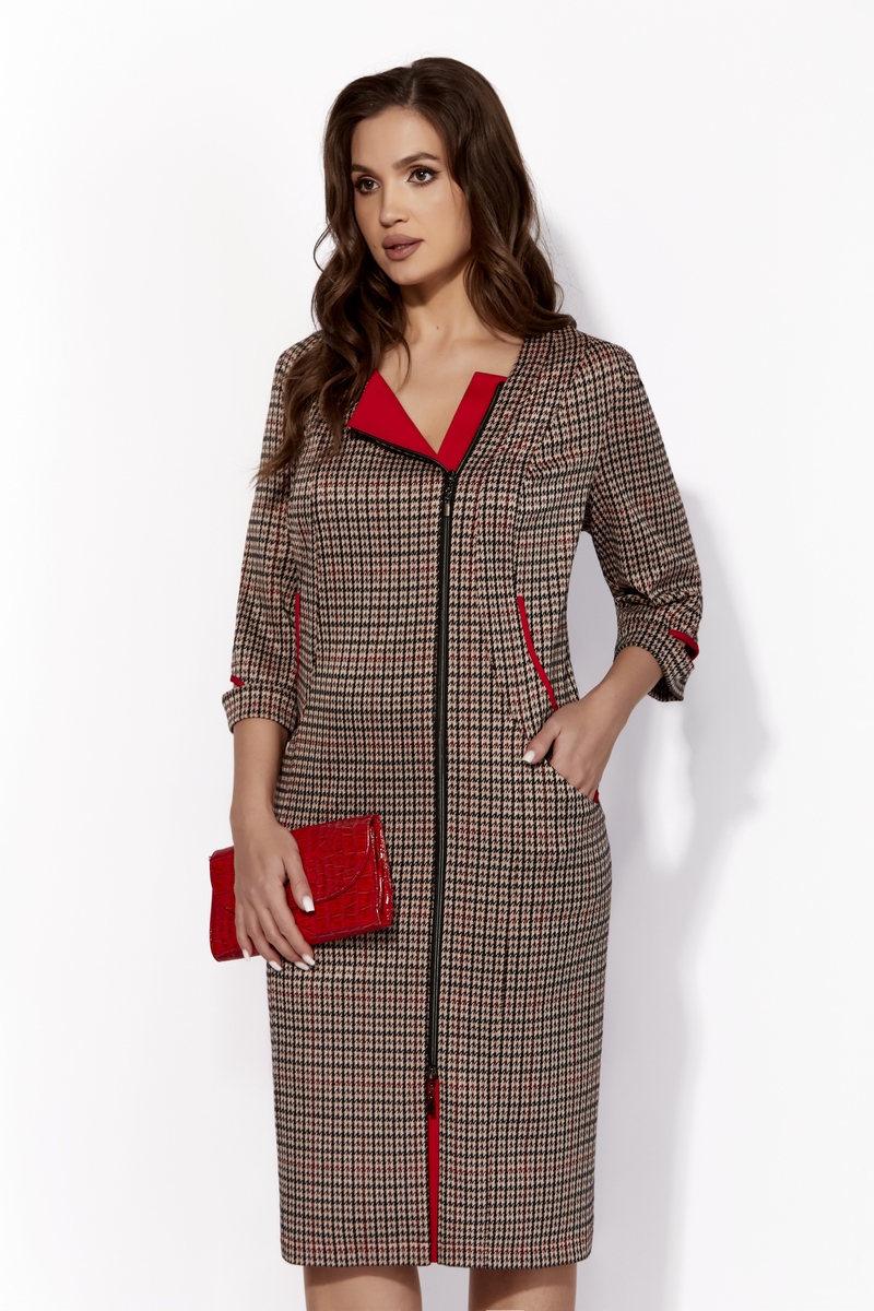 Эти элементы гармонично сочетаются с модными тенденциями: узор мелкой гусиной лапки, отделка из красного трикотажа, стильные детали и акценты — все это придает платью актуальный и современный вид, делая его идеальным для тех, кто ценит индивидуальность и стиль.
